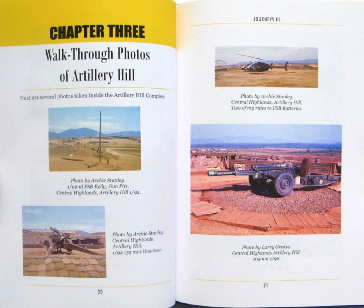 砲兵の丘の空からの航空写真、砲兵の丘からの周囲回転写真、砲兵の丘の通り抜け写真、プレイ・トラップ渓谷脱出と回避の話、砲兵の丘からの道路沿いの写真、砲兵の丘からベンヘットへの飛行での写真、交戦地帯ベンヘットの写真、写真と話:統合観測システム、写真と話:火力支援基地の戦闘、写真と話;統合観測システムの移転、リユニオン1:33年後、ソ連の干渉と米国の反干渉、リユニオン2:33年後ジョニー・ジェイムス・バッソの全13章に分けて、写真を掲載し簡単なエッセイを載せている。