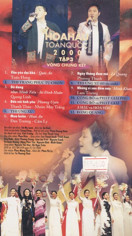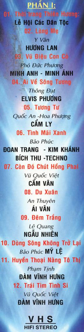 歌の方は、MTV、エルヴィス・フォン、ゴク・フエ、リー・ハイ、フオン・タィン、ダリーナ、ホン・ニュン、ラム・チュォンなど。
