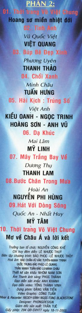 歌は、ホン・ニュン、ラム・チュォン、チャン・トゥ・ハー、リー・ハイ、タム・カ・3A、フオン・タィンなど。1本目、2本目ともにファッション・ショーあり。